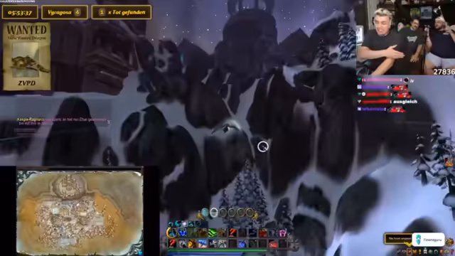11:01:20Kevin äußert seine Freude und Zufriedenheit über den Fund des ZVPD, der sich am Ende gelohnt hat. Er plant, das Mount immer zu benutzen. Der Streamer gibt Anweisungen, wie andere Spieler beitreten können, einschließlich des Aktivierens des War-Mode. Es wird ein Geheimnis über den Charakter des Streamers gelüftet, dessen Name aus Gründen des Stream-Snipings geändert wurde. Die Community stellt sich für ein Gruppenfoto auf, wobei die Gilden-Chefs in den Vordergrund treten. Der Streamer bedankt sich bei allen Beteiligten, insbesondere bei Rita und Basti, ohne deren Hilfe der Erfolg nicht möglich gewesen wäre. Es wird ein weiterer Screenshot mit dem ZVPD geplant, bei dem sich der Streamer und Basti neben ihn legen. Es werden Anweisungen gegeben, wie man sich für das Foto positionieren soll, und es wird auf störende Elemente im Bild geachtet.