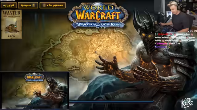 11:32:19Die Gruppe steht vor dem letzten Boss des Dungeons, dem Lichkönig. Der Streamer teilt die Gruppe auf und gibt Basti die Aufgabe, den Boss allein zu besiegen. Es kommt zu einigen technischen Problemen, aber sie schaffen es, den Boss zu besiegen. Während des Kampfs erinnert sich der Streamer an seine Erfahrungen mit diesem Raid aus seiner Kindheit, als er als junger Spieler mit seiner Gilde versucht hat, diesen Boss zu bezwingen.