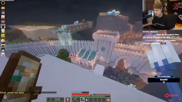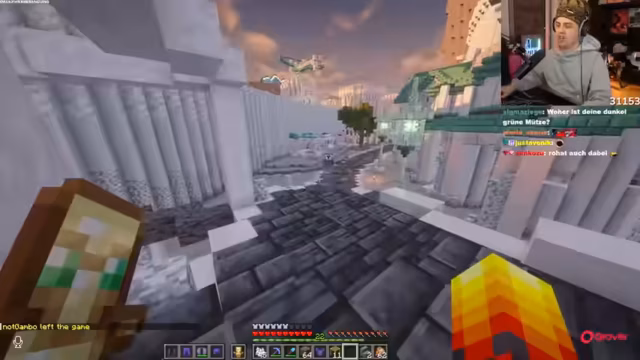 03:31:08Nach den Ratespielen konzentriert sich der Streamer auf den Bau von Minas Tirith im Minecraft-Server. Er zeigt den aktuellen Baufortschritt, insbesondere die an der Brücke befindlichen Quarzlager, und nimmt Anregungen von Zuschauern entgegen. Es werden Diskussionen über die Gestaltung von Turmen, Gebäuden und Dekorationen geführt. Die Zusammenarbeit mit anderen Teilnehmern ist zentral, wobei Materialien wie Quarz und Emeralds gehandelt und effizient genutzt werden, um den Bauplan fortzuführen.