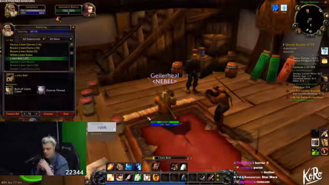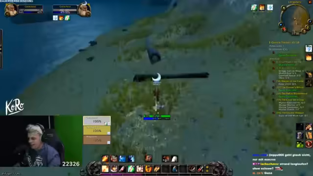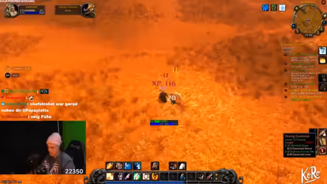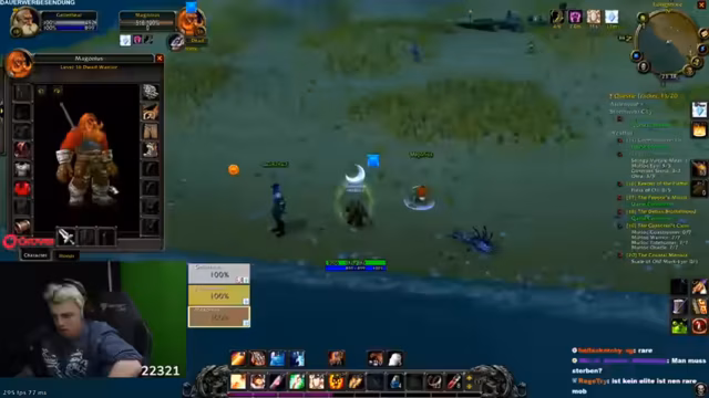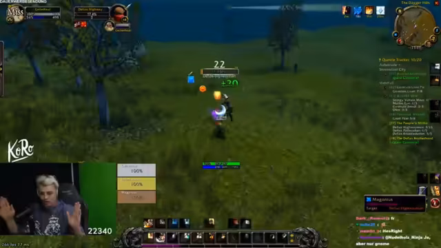 05:01:46Der Streamer befindet sich im Spiel World of Warcraft und ist in der Defias-Burg. Sein Ziel ist es, die Quest 'Volksmiliz' abzugeben und die nächste gemeinsame Quest mit seinen Gefährten zu starten. Da seine Mitstreiter noch nicht bei der selben Quest sind, wartet er, bis sie aufschließen, um die Quests gemeinsam abzugeben und neue anzunehmen. Parallel dazu versucht er, seinen Battlenet Launcher zu starten, der jedoch als extrem langsam beschrieben wird, was ihn daran hindert, direkt weiterzuspielen.