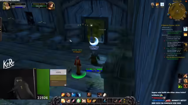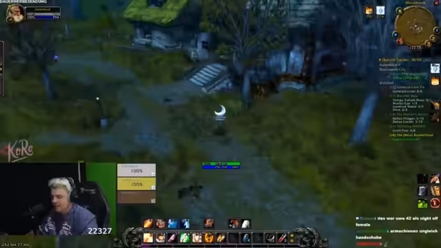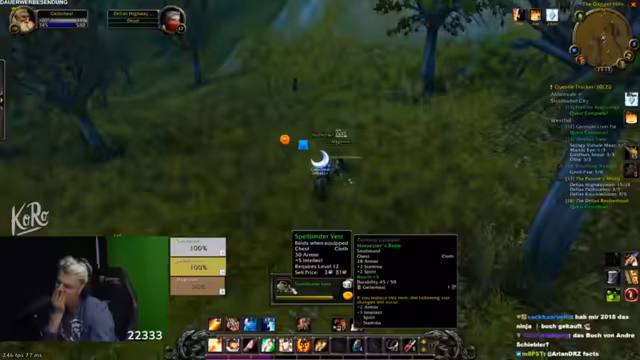 05:14:03Der Streamer erklärt Verzauberungsmechaniken und gibt Tipps zur Nutzung von Rüstungssets. Es entsteht eine Debatte über Nachtelf-Charaktere, wobei die Mehrheit bestätigt, dass viele Spieler weibliche Nachtelfe bevorzugen. Dabei wird humorvoll diskutiert, ob ein weiblicher Night-Elf-Charakter tatsächlich von einem Mann gespielt wird, während praktische Ratschläge zur Item-Nutzung gegeben werden.
