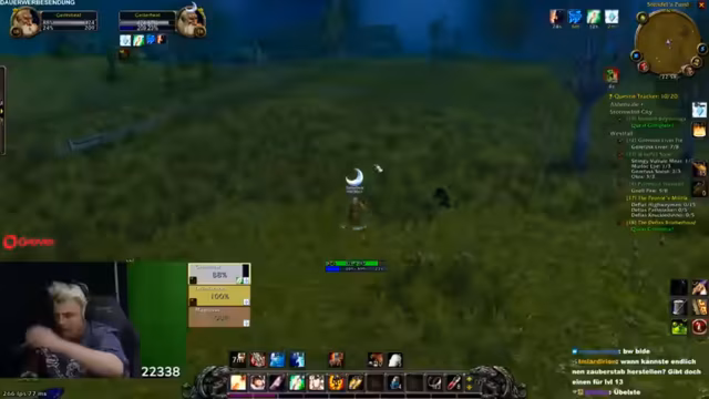 05:01:46Der Streamer plant die nächsten Quests, während der Battlenet-Launcher extrem langsam lädt. Er erkundet die Defiasatzen-Quest, die zu hoch für das aktuelle Level ist, und überlegt, zuerst andere Quests abzuschließen. Dabei erwähnt er, dass alle Downloads schnell gehen außer Battlenet, was ihn zwingt, eine Stunde zu warten. Er erkundigt sich nach dem Status von Teammitgliedern und ob sie bestimmte Addons nutzen können, um Questfortschritte zu prüfen.