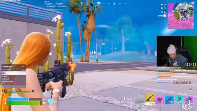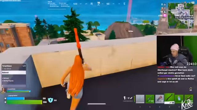 00:22:08Yoshi X, alias Mr. Fashion, tritt dem Stream bei. Er ist ein Freund mit dem die Streamer privat viel Fortnite spielen. Es wird die Challenge 'Triathlon' vorgestellt. Dies ist ein von Max ins Leben gerufener Marathon, der aus drei aufeinanderfolgenden Runden in den Modi Blitz, Reload und der neuen Season bestehen muss. Die Reihenfolge ist vorgegeben und ein Misserfolg bedeutet einen Neustart. Yoshi Xs ungewöhnliche MMO-Maus mit vielen Tasten wird vorgestellt und als Vorteil erwähnt.