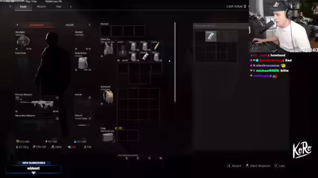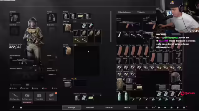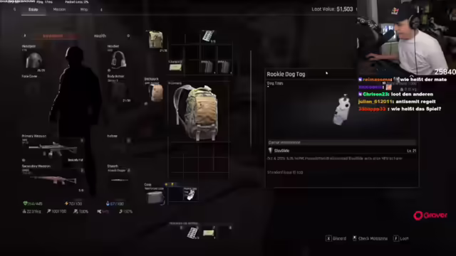 06:32:18Nach einer erfolgreichen Runde, in der er zwei Spieler und fünf Bots getötet hat, zeigt der Streamer, wie er die erbeutete Ausrüstung in seinem Stash verstaut, um sie in der nächsten Runde verwenden zu können. Er erklärt, dass man seinen Stash upgraden kann, aber dass dies optional ist. Er repariert seine Weste und überlegt, ob er ein zweites Magazin mitnehmen soll. Er füllt seine Vorräte auf und nimmt Granaten mit. Er startet eine neue Runde und entscheidet sich für den Solo-Ops-Modus. Er erklärt, dass er, wenn er stirbt, eine Drittelmillion verlieren wird, aber dass er zum Glück relativ viel Geld auf dem Account hat. Er vermutet, dass die Entwickler ihm einen guten Account gegeben haben, weil sie davon ausgehen, dass er oft sterben wird. Er findet sehr schnell eine neue Runde.