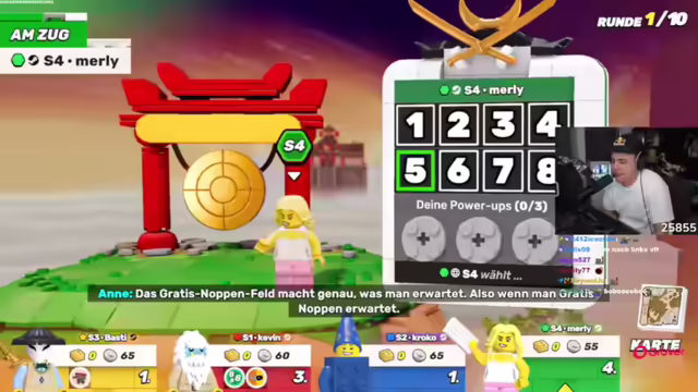 10:32:12Es werden verschiedene Taktiken diskutiert, darunter die Frage, ob es klug ist, zu verlieren, um als Erster an der Reihe zu sein. Er äußert den Wunsch, dass das Spiel schneller abläuft. Es wird befürchtet, dass jemand stürzt und zu einem riesigen Schneeball wird. Er gibt zu, mit Absicht verloren zu haben. Es wird überlegt, sich auf das Feld von Kevin zu stellen, um dessen Untergang mitzuerleben. Er landet auf einem Duell-Feld und telefoniert mit einem Affen. Es wird ein Battle gespielt, bei dem es darum geht, goldene Steine zu sammeln. Er überlegt, das nächste Minispiel auszusetzen. In der letzten Runde versucht er, vier Blöcke aufzuholen. Es wird ein Mini-Golf-Spiel gespielt, das als Müllspiel bezeichnet wird. Basti blockt den Ball von Merle, was für Aufregung sorgt. Am Ende erhält der Letzte einen Stein, was als cooles Feld bezeichnet wird. Er wird in eine weitere Runde hineingezogen und freut sich darauf. Es kommt zum großen Finale, bei dem die Auflösung erwartet wird. Basti gewinnt das Spiel, nachdem Merle in der letzten Folge den Sieg errungen hatte. Es wird eine XL-Folge mit 8 Stunden Lego Party angekündigt.