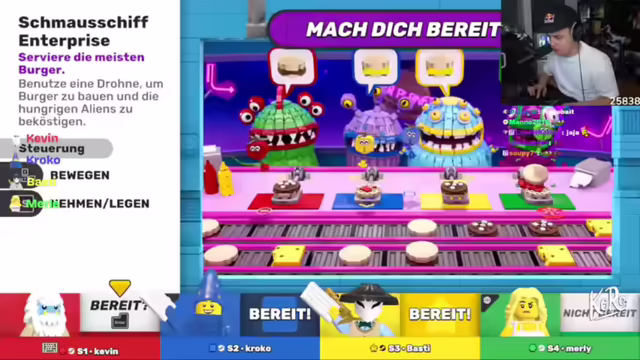 09:01:54Es wird ein Minispiel namens 'Tolle mit Stollen' ausgewählt, bei dem es darum geht, Burger für Aliens zu bauen. Die Steuerung wird als schwierig empfunden, und es kommt zu Frustration. Ein Spieler gewinnt das Minispiel, was als überraschend empfunden wird. Es wird überlegt, ob man ein Power-Up abholen soll, und es wird festgestellt, dass ein Spieler wegen eines anderen Spielers Noppen fehlen. Es wird überlegt, ob man das Klaufeld eines anderen Spielers nutzen soll. Es wird eine Schlange auf dem Spielfeld entdeckt, die zu Problemen führt. Es wird über overpowered Items diskutiert und festgestellt, dass nicht alles overpowered ist.