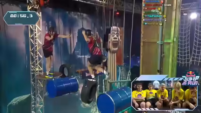 02:13:34Team Revi startet in die zweite Welt auf der Airstage. Revi legt einen schnellen und sicheren Start hin, gefolgt von Julia, die mit den schwankenden Elementen zu kämpfen hat. Ein Problem mit einer Truhe tritt auf, wird aber schnell behoben. Tomatolix findet den Schlüssel in derselben Truhe. Das Team arbeitet sich ruhig voran und erreicht die Kokosnüsse. Es wird spekuliert, ob die Kommentare die Spieler beeinflussen, da diese vermutlich im Adrenalinrausch sind. Die Kokosnüsse werden gesammelt und in den Mund geworfen, wobei Trimax und Tomatolix sie in ein Körbchen legen müssen, um gültig zu sein. Julia sammelt eine Münze ein, während Trimax und Tomatolix die restlichen Kokosnüsse einsammeln. Sie sparen viel Zeit im Vergleich zum vorherigen Team. Trimax zieht die Netze straff, um den Widerstand zu verringern, während Revi die Münze im Mund transportiert. Julia zeigt eine starke Leistung. Nach den Cargonetzen geht es zu den Lianen, wobei Revi die Münze nicht verlieren darf. Ein beinahe-Absturz wird gerade noch gerettet. Julia meistert das Pedalo und erreicht das letzte Hindernis vor dem Buzzer. Das Team erzielt eine Zeit von 4:09,6 und sichert sich damit den ersten Platz.
