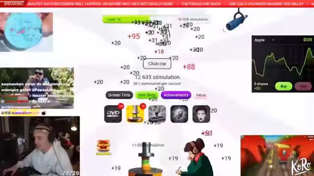 01:06:17Papaplatte setzt sein Spiel mit 'Stimulation Clicker' fort und kommentiert die Absurdität des Spiels, indem er sich vorstellt, es jemandem vor 20 Jahren zu erklären. Er verbessert die hydraulische Presse und schaltet Achievements frei, die zusätzliche Stimulationen bringen. Als Nächstes werden ASMR Slime Videos freigeschaltet, die passive Stimulationen bieten, und die Farbe der DVDs ändert sich beim Aufprall. Er beschleunigt die hydraulische Presse und schaltet den 'Typen der Frist' frei. Es folgen Popcorn-Animationen und die Möglichkeit, beim Spielen zu schummeln, indem man die Enter-Taste drückt. Er aktiviert die Screen Time Anzeige und schaltet den True Crime Podcast frei. Die hydraulische Presse wird automatisiert, und Corner-Hits bringen jetzt 10-fache Stimulation. Schummeln durch Verkleinern des Fensters wird entdeckt, und der Itemshop mit Google-Zauber, Lootboxen und Trails wird freigeschaltet. Papaplatte beschreibt die zunehmende Reizüberflutung durch die verschiedenen Elemente im Spiel, darunter ein Typ, der isst, Subway Surfer, ASMR, eine Presse und ein True Crime Podcast.