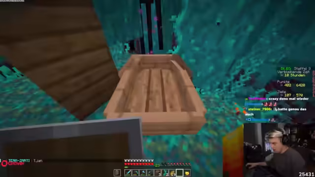 02:52:49Die Spieler erwägen, die Netherdecke zu erreichen, stellen jedoch fest, dass ihnen Obsidian fehlt, um ein Portal zu bauen und zurückzukehren. Sie beschließen, dies auf später zu verschieben und stattdessen mehr Enderperlen im End zu sammeln. Die Community im Chat informiert sie darüber, dass sie Obsidian als Belohnung für die Netherdecke erhalten könnten, möglicherweise zehn Blöcke. Dies könnte es ihnen ermöglichen, direkt nach oben zu gehen, ohne zum Portal zurückkehren zu müssen. Mit insgesamt 16 Enderperlen (sechs vom einen Spieler, zehn vom anderen) sind sie bereit, sich auf den Weg zum End zu machen. Sie fragen im Chat nach der höchsten Blockhöhe im Nether, die 127 beträgt, um sich dort durchzugraben und mit einer Enderperle den Weg zu finden. Die Spieler bereiten sich darauf vor, eine Leiter zu craften und sich durch die Netherdecke zu arbeiten, wobei sie auch ein Feuerzeug für das Portal benötigen.