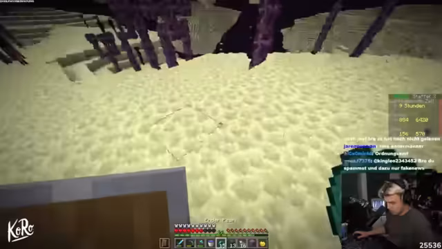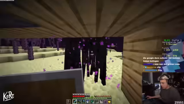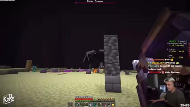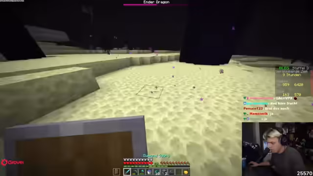 04:37:53Die Spieler befinden sich im End und diskutieren über die Schwierigkeit von PvP-Spielen in WoW, wobei sie die Notwendigkeit von 20 Tasten und das Beobachten mehrerer Gegner hervorheben. Während des Enderdrachen-Kampfes kommt es zu einer unerwarteten Wendung: Einer der Spieler, Rax, isst eine Chorusfrucht und wird aus dem End teleportiert, wobei er bei den Koordinaten 0-0 in der Overworld spawnt. Das ursprüngliche Endportal befindet sich 7.000 Blöcke entfernt. Dies führt zu einer schwierigen Situation, da der verbleibende Spieler den Enderdrachen alleine besiegen und die benötigten XP sammeln muss. Es wird überlegt, wie man am besten vorgeht, um die Situation zu meistern, wobei der Fokus auf dem Sammeln von Essen und dem erneuten Töten des Drachens liegt.