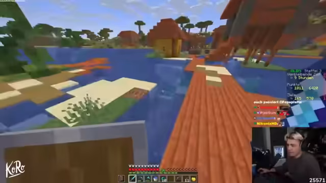 01:40:39Die Spieler begeben sich auf den Weg zu einem Dorf, um zu handeln. Nebenbei suchen sie nach Papageien, von die fünf getötet werden müssen. Dabei wird diskutiert, ob man Papageien anlocken kann, indem man sie mit Keksen füttert. Die Nacht bricht herein und einer der Streamer gibt zu, dass er als Erwachsener immer noch Angst vor der Dunkelheit hat. Währenddessen wird versucht, einen Trident im Wasser zu finden.