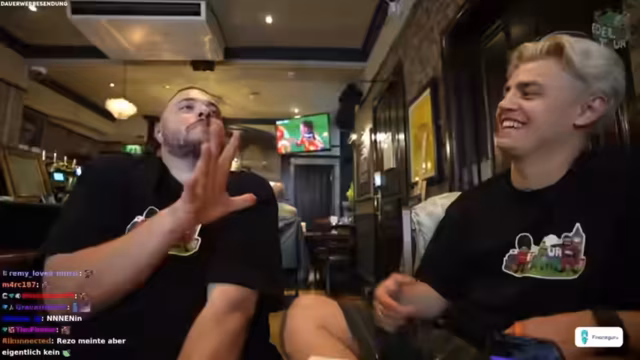 07:29:29Bei einem Eiscafé in London gibt es eine zufällige Begegnung mit einem Zuschauer und dessen Ex-Freundin, die dort arbeitet. Die Jungs machen spontane Fotos und es entsteht ein amüsantes Missverständnis, als der Streamer versucht, jemanden auf einem Foto zu erkennen, der auf dem Pissoir war. Die Gruppe beschließt, noch heiße Schokolade zu trinken, wobei die Kamera einen lustigen Clip mit einem frisch gedruckten, nicht funktionierenden Kassenbon aufnimmt.