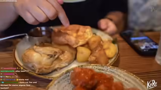 06:50:10Der Streamer ist begeistert von der Auswahl an Speisen, die serviert wird. Es gibt ein halbes Chicken Roast, Yorkshire Pudding, Kartoffeln und eine Entscheidung zwischen scharfen Chicken Wings mit Korean BBQ oder Peri Peri. Das Essen wird als krass und übelst lecker beschrieben. Eine Diskussion entsteht über den Geschmack des Yorkshire Puddings, der leicht fleischig schmeckt und eventuell in Entenfett zubereitet wurde. Zudem wird die Kategorisierung als vegetarisch thematisiert und erklärt.