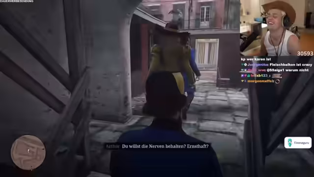01:04:14Nach der aufregenden Befreiungsszene geht es mit einer Mission in Annisburg weiter. Da die Gruppe finanziell stark unter Druck steht, müssen sie Schulden eintreiben. Parallel dazu wird die Ehre des Charakters thematisiert, da der Streamer Wert darauf legt, sie hochzuhalten, um Zugang zu bestimmten Quests, wie der Straß-Mission, zu erhalten. In diesem Zuge wird auch über andere Spielmechaniken, wie das Putzen von Waffen, diskutiert.