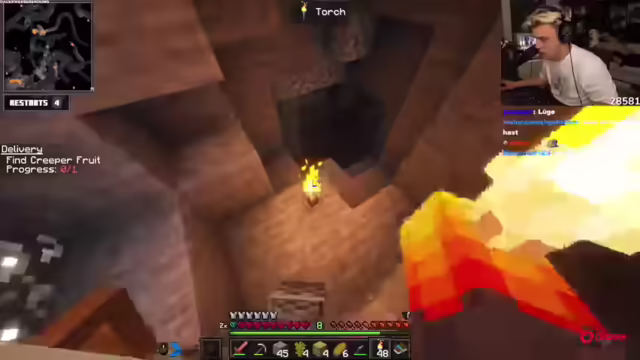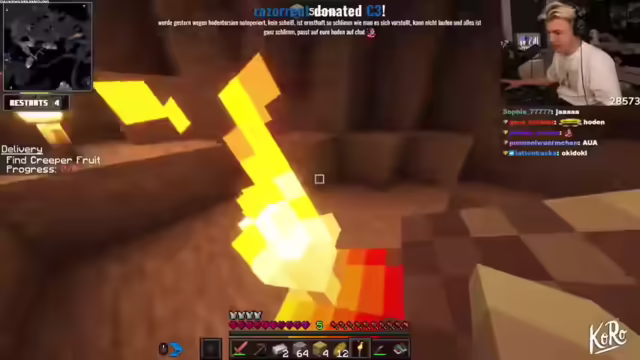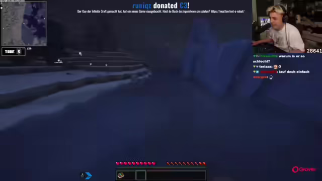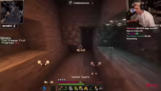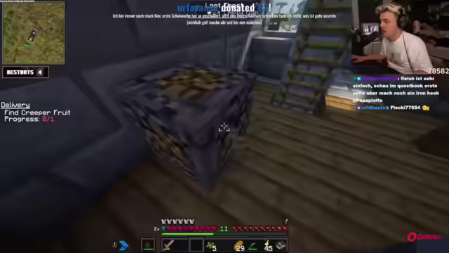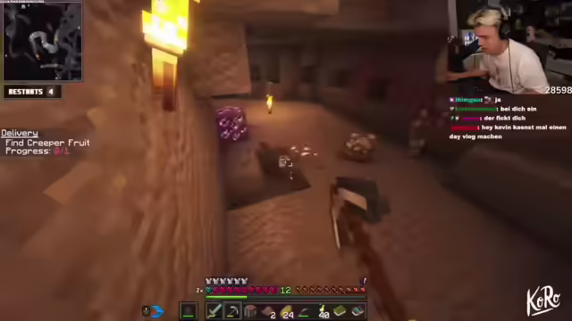03:05:08Ein Creeper wird entdeckt und es wird überlegt, die Creeper Fruit für eine Quest zu bekommen. Es wird diskutiert, wie man die Creeper Fruit erhält, möglicherweise indem man Creeper in der Sonne tötet. Es wird festgestellt, dass man stärker geworden ist und mehr Schaden verursacht. Kühe oder Schafe werden für Leder gesucht. Es werden Bilder von Dominik und Wieland kommentiert, die als sehr sexy bezeichnet werden. Kühe werden gesichtet und Schweine werden für Proteine getötet. Es wird überlegt, ob Esel Leder bringen. Ein Pillager-Ding wird entdeckt, aber die Pillager greifen nicht an. Es wird vermutet, dass der Hut den Spieler unbesiegbar gegen die Pillager macht. Ein toter Base-Dog wird gefunden, der Leder droppen kann. Es werden drei Leder gefunden, was als "Insaner Call" bezeichnet wird.
