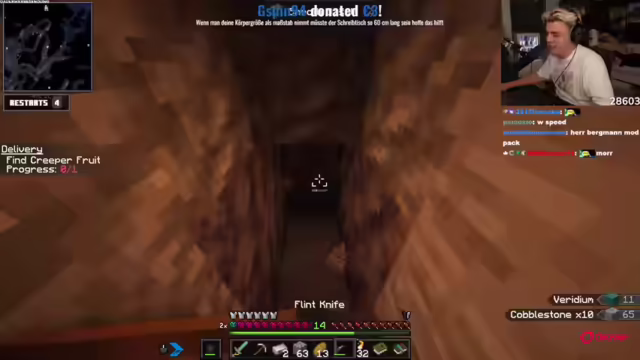 03:17:23Eisen und Kohle werden gefunden. Nach dem Upgrade des Rucksacks mit Crafting Table und Ofen wird überlegt, ob man überhaupt noch eine Base benötigt. Stattdessen könnte man auf Erkundungstour gehen und Dungeons erkunden. Es wird eine neue Dimension namens Undergarden erwähnt. Die nächste Quest ist das Smelting Upgrade, wofür Redstone benötigt wird. Der Schreibtisch des Streamers wird beschrieben. Der Crafting-Table wird in den Rucksack gezogen. Es wird überlegt, die Bratpfanne als Waffe zu craften. Es wird extrem viel Eisen für die Eisenrüstung gesucht. Es wird sich gefragt, in welcher Ebene Redstone zu finden ist. Es wird sich erinnert, dass es einen Grund gab, warum man nicht mehr in einem bestimmten Bereich der Höhle sein wollte.