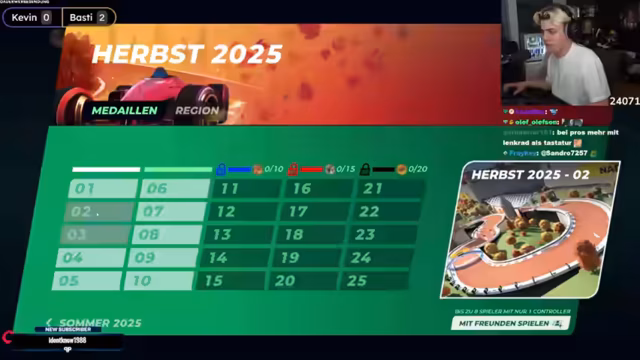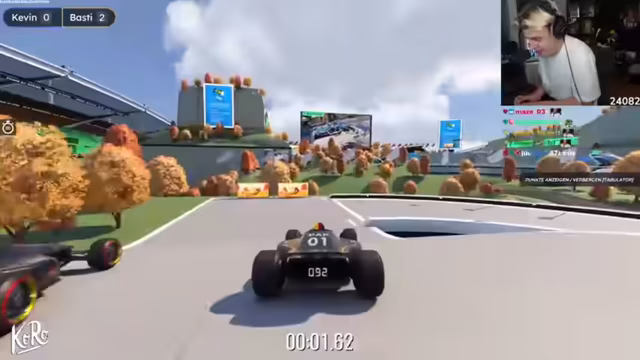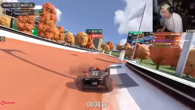 04:18:29Die Streamer starten die erste Map der Trackmania-Challenge mit einem Timer von fünf Minuten pro Map. Sie einigen sich darauf, ungemutet zu bleiben, um die Interaktion zu fördern. Der unerfahrene Spieler Papaplatte muss sich zunächst mit der Steuerung vertraut machen und die Map erkunden. Boostflächen und Checkpoints werden erklärt. Nach einigen Versuchen erzielt Papaplatte eine Zeit von 25,6 Sekunden, während Basti eine 24,2 erreicht und sogar die Autorenmedaille gewinnt. Die Zeiten werden nicht direkt verraten, um die Spannung zu erhöhen. Es kommt zu einer knappen Entscheidung, bei der Papaplatte im letzten Versuch eine Zeit von 22,147 erreicht, während Basti mit 22,6 knapp dahinter liegt. Die knappen Ergebnisse sorgen für Begeisterung. Die zweite Map, eine Offroad-Strecke, wird gestartet. Papaplatte erzielt eine 24er-Zeit, während Basti sich auf 19,4 verbessert, was zu Diskussionen über die Glaubwürdigkeit führt. Die Streamer betonen die Qualität des Spiels, obwohl sie sich noch auf das Fahren konzentrieren müssen und Schwierigkeiten haben, sich Streckenabschnitte zu merken.