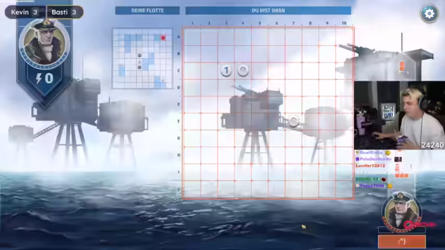 06:14:56Der Streamer und sein Gegner spielen eine modifizierte Version von Schiffe versenken. In diesem Spiel erhalten die Spieler Punkte, wenn sie getroffen werden, die sie für spezielle Fähigkeiten einsetzen können. Zu diesen Fähigkeiten gehören Minen, die zwei Schüsse zurückwerfen, ein Echolot, das umliegende Felder nach Treffern scannt, Bomben, die ein 2x2-Feld abdecken, und Luftangriffe, die eine komplette Reihe horizontal oder vertikal durchschlagen. Die Kosten für diese Fähigkeiten variieren je nach ihrer Wirkung. Während des Spiels kommt es zu humorvollen Anschuldigungen des Cheatings und Diskussionen über die Taktiken, wie das Aufdecken von Schiffen, um dem Gegner keine zusätzlichen Punkte zu ermöglichen. Der Streamer hat das Gefühl, dass sein Gegner sehr strategisch vorgeht und viel Erfahrung in diesem Spiel hat.