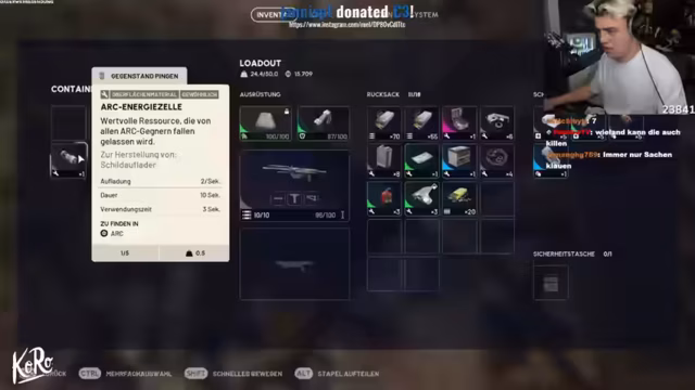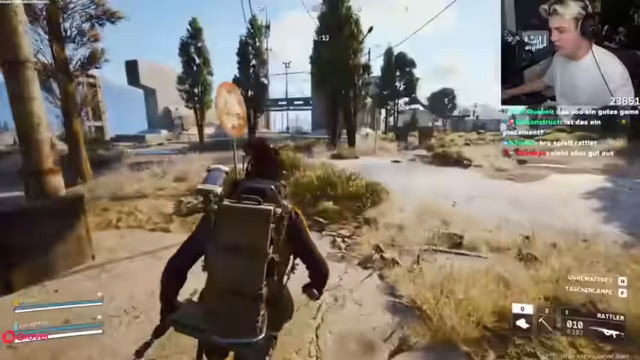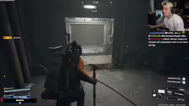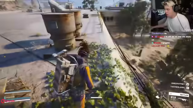 01:48:02Es wird über Twitch Prime Subs gesprochen und die Spieler bereiten sich auf die nächste Runde vor. Ein Spieler hat wenig Geld und muss Kabel kaufen. Es wird festgestellt, dass man Westen zerstören muss und dass der Akku für eine Quest recycelt werden musste. Die Spieler diskutieren über 'Decks' und 'Besor'-Skins. Sie beschließen, direkt in die Rote Zone zu stürmen, um PvP zu finden. Die Spieler bemerken, dass sie mit ihrer Ausrüstung wie 'Voloser' aussehen. Sie nutzen das Ping-Rad, um Gefahren anzuzeigen, und schleichen sich an einem Gebäude mit Geschütztürmen vorbei. Sie hören Schüsse und sehen, wie jemand angegriffen wird.