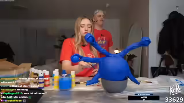 02:15:25Gemeinsames Bemalen des Monsters in den Farben Blau und Grün, oft als Highlights und Lowlights bezeichnet. Entscheidung für die Farbgebung des Mundes in Rot innen und Blau außen. Diskussion über verschiedene Künstlernamen wie Tyler the Creator, Elton John und Post Malone. Spontanidee für zukünftige handwerkliche Streams, wie z.B. Tischbau, mit verschiedenen potenziellen Partnern. Technische Probleme mit den Mikrofonen und Akkus während der Malerei.