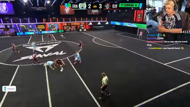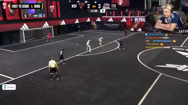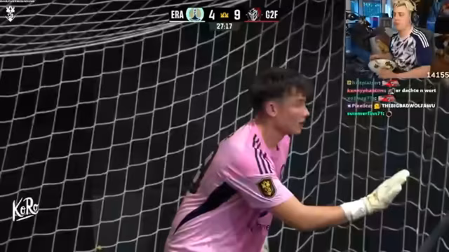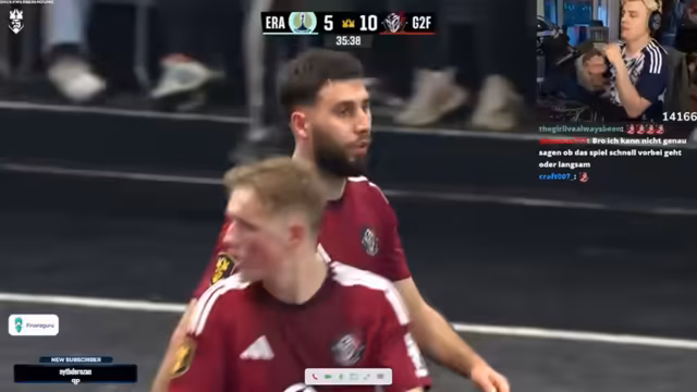 04:00:45Das Spiel wird durch eine längere Unterbrechung und Verletzung des Star-Spielers der gegnerischen Mannschaft unterbrochen. Danach entwickelt sich ein packendes 5 gegen 5 mit nervenaufreibenden Situationen. Das Team nutzt den verletzungsbedingten Torwartwechsel des Gegners und Finn Hanke schießt das Siegtor in eine unbesetzte Tor. Der Streamer ist überwältigt von dem 'kranken Trap' und feiert den verdienten Sieg gegen die ungeschlagenen No Rules.