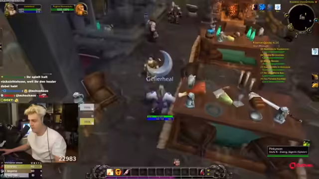 05:35:53Ein Streamer scherzt über extreme Vorhaben im Rahmen des WoW-Projekts, wie eine Woche ohne Schlafen oder den beschaffungs von Kokain. Dies dient als Running Gag innerhalb der Stream. Die Gruppe kämpft weiterhin mit den Quests, insbesondere dem Sammeln von spezifischen Item-Teilen. Es kommt zu einem Todesfall, weil der Healer kein Mana mehr hat, was die Verwundbarkeit des Teams ohne Ressourcen zeigt und die Dringlichkeit unterstreicht, die Quest schnell abzuschließen.