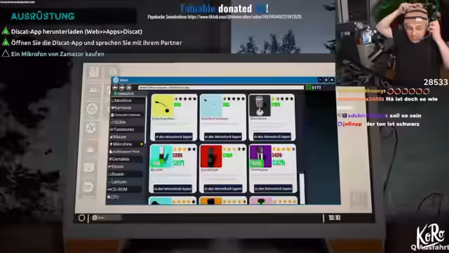 01:33:11Der Streamer lädt die Discat App herunter und öffnet sie. Er chattet mit Felix, der ihm Tipps zum Streaming gibt. Er meldet sich auf der Dodo-Website an und sucht ein Mikrofon auf Zamasor. Er lädt das OPS-Programm und DonateLab herunter. Er wird ein erfolgloser Streamer. Er soll seine Ausrüstung verbessern und eine Kamera kaufen. Er bestellt super schnell Lieferungen und kauft ein Echotone Basic Mikrofon in weiß. Er schläft und speichert das Spiel. Sein Ziel ist es, 500 Follower zu erreichen. Miguel kommt vorbei und redet komisch. Der Streamer macht seinen ersten Stream und braucht einen Stream-Schlüssel. Er gibt den Stream-Schlüssel ein und streamt in 1080p. Der Stream ist Pixel für Pixel. Er leakt seinen Stream-Key. Er hat einen Zuschauer und 0 FPS. Er nimmt die Quali runter und streamt in 480p. Er sagt, dass Leute, die Abonnenten abschließen, dumm sind.