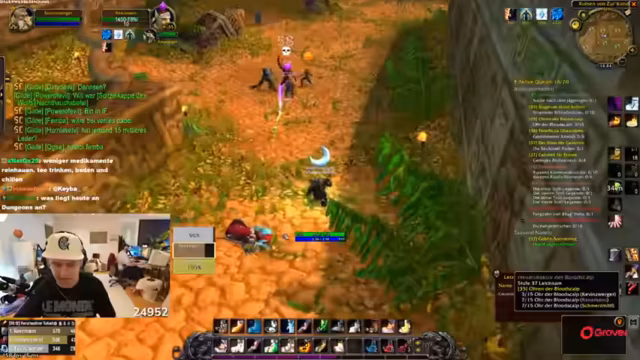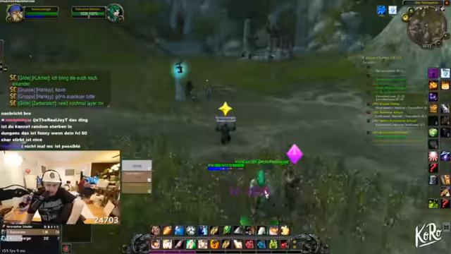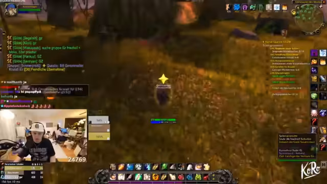 04:23:00Nachdem der Buff-Plan und die Dungeon-Anpassungen geklärt sind, geht es weiter mit dem Sammeln von Questitems. Es wird die Suche nach 'Donnernder Glücksbringer' thematisiert. Gleichzeitig kommt es zu kleineren technischen Problemen und einer verbalen Verwechslung bei einem Spielernamen, die humoristisch kommentiert wird. Der Fokus bleibt auf dem Erreichen der nächsten Questziele.