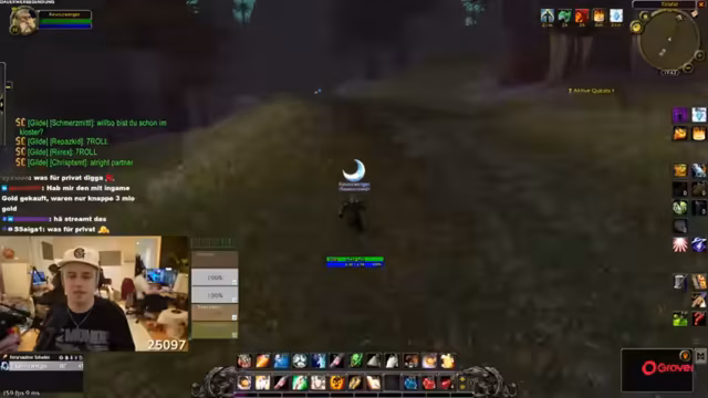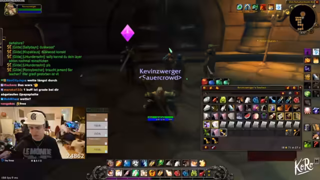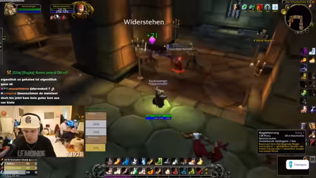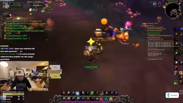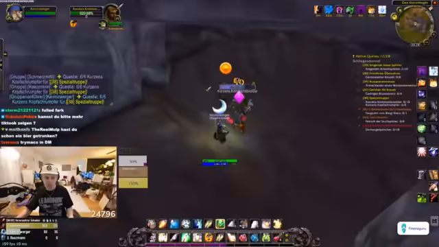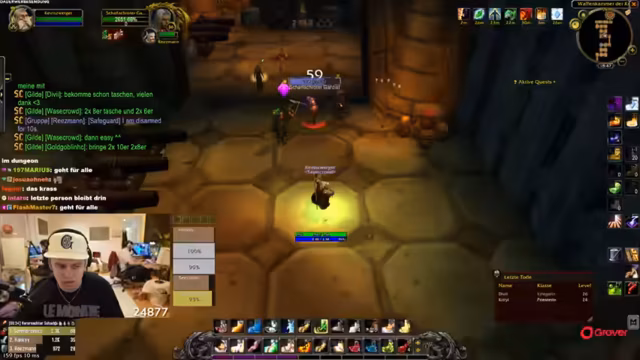 09:56:56Die Gildendynamik steht im Fokus, als eine Diskussion über die Stürzung der Menschenkönigin aufkommt. Dies entwickelt sich zu einem 'kompletten Fiebertraum'. Zwischen diesen hitzigen Debatten widmen sich die Streamer dem Gameplay in Gnomeregan. Wieland nutzt ein Blackjack-Addon, während es um Item-Loot und die Entscheidung, Gegenstände zu entzaubern oder zu verkaufen, geht. Max erlebt einen kritischen Moment, und eine spontane Aktion führt dazu, dass Wieland allein zurückbleibt und sich orientiert, während die anderen weiterziehen.