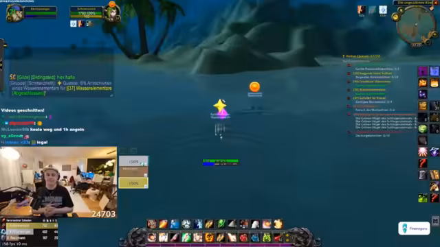 10:00:26Das Team gerät in eine heikle Situation, als sie einen starken Wasserelementar angreifen, was zu einem chaotischen Kampf führt. Wieland ist disorientiert und befindet sich versehentlich in 'the Perkies'. Sie versuchen, den Boss durch Pullen und sofortigen Rückzug zu besiegen. Die Strategie ist riskant, und Henki bleibt auf extrem niedriger Lebensenergie, was zu starker Nervosität bei Wieland führt, der Angst hat, den Gildenmitglied zu verlieren. Sie beschließen den Boss 'Firststrap' zu bekommen.