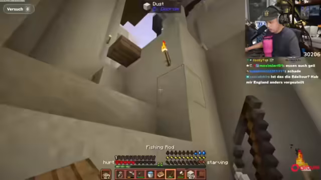 04:27:42Der Stream gerät in eine kritische Phase, als Sauerstoff, Wasser und Nahrung knapp werden. Unter Zeitdruck werden Strategien entwickelt, um diese Ressourcen zu sichern. Die Chat-Community wird intensiv eingebunden, um Lösungsvorschläge zu erhalten und Quests zu klären. Dabei wird der Verlust von Lebenspunkten durch unzureichende Nahrung und Flüssigkeit thematisiert, was den Druck erhöht.
