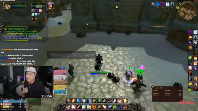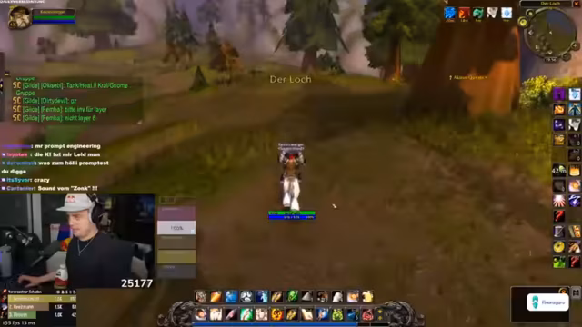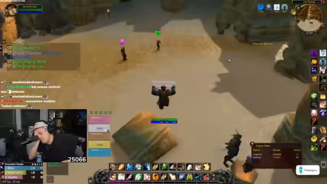 03:14:15Die Gruppe beschließt, einen High-Level-Dungeon, den Ulderman, zu machen. Die Suche nach einem geeigneten Tank gestaltet sich schwierig, da viele Spieler unterlevel sind. Der Streamer wirft der Gildenleitung vor, für den Verlust eines Magiers namens Freddy verantwortlich zu sein. Eine Revolution der Gnome, die angeblich keine Flugpunkte nutzen dürfen, wird vorbereitet. Der Streamer bittet Wilbo um 50 Gold, um seinen Mount zu finanzieren.