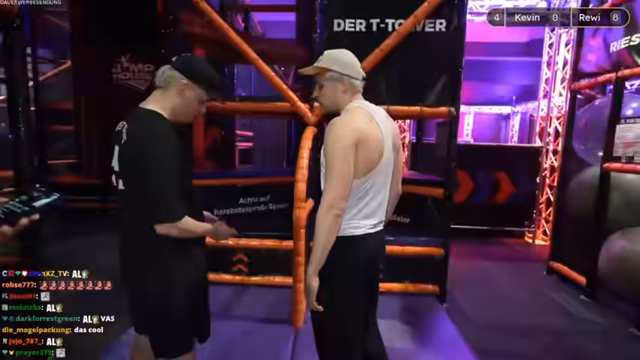 00:18:30Nach dem Betreten der Halle beginnen die Streamer mit der Vorbereitung auf die Spiele. Sie diskutieren über die Kleiderordnung, merken sich ihre Haare und tauschen sich über Allergien aus. Das erste Spiel ist ein Parcours, bei dem es um Geschwindigkeit geht. Ein zweites Spiel besteht darin, mit einem Gegenstand so viele Leuchtpunkte wie möglich zu treffen, wobei die Punktzahlen von Rewi (213) und Kevin (162) eingetragen werden. Ein drittes Spiel ist ein Basketball-artiges Wurfspiel auf Zeit.