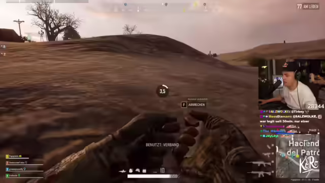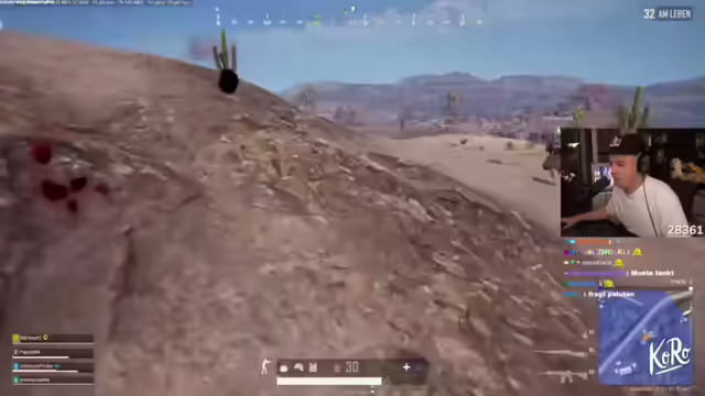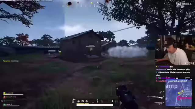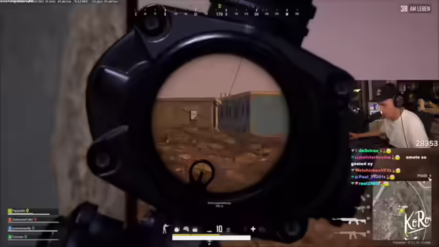 05:26:51Die Gruppe landet im Fishing Camp und freut sich über den Heavy Loot. Der Streamer äußert seinen Spaß am Spiel, während er gleichzeitig Stream-Sniper befürchtet. Er hat ein Vierer-Zielfernrohr und fragt nach, ob jemand Hilfe benötigt. Koko wird nach seinem Befinden gefragt und der Streamer bietet seine Hilfe an. Es folgt eine Diskussion über die Dragunov und die M416 als beste Waffen. Zwei Gegner greifen an und es stellt sich heraus, dass Koko falsch geflogen ist. Es wird über die Möglichkeit diskutiert, Koko zu retten und ob Gegner den Chip mitnehmen können. Der Streamer bittet den Chat, keine zehn Jahre über die koreanischen Schriftzeichen zu diskutieren, da dies offensichtlich nicht cool ist. Ein Gegner wird ausgeschaltet und der Streamer fragt nach einem Marker. Er kann mit seiner Waffe nicht zoomen und benötigt Cover. Er findet PUBG unironisch gerade richtig geil und lobt Kevins gute Hits. Er hat keinen Helm mehr und keine Munition mehr. Es wird überlegt, ob man Kroko loslassen muss, um das Spiel noch zu gewinnen. Der Streamer fragt, ob Gegner die Karte mitnehmen können und markiert Positionen. Er gibt an, zwei Hits mit der DMR gelandet zu haben, glaubt aber nicht, dass diese stark genug ist.