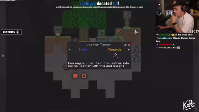 02:00:19Es wird ein Wooden Shield hergestellt. Der Streamer überlegt, ob er jetzt schon eine Kuh töten soll und entscheidet sich dann, ein Backpack herzustellen. Dafür werden vier Strings, vier Leder und eine Kiste benötigt. Er überlegt, ob er auf die Nacht warten und versuchen soll, eine Spinne zu töten, um an Strings zu gelangen. Stattdessen wird ein Copper Sword hergestellt. Der Streamer hat den Ofen im Dorf vergessen. Als nächstes sollen Kühe gesucht werden. Der Streamer sucht nach Kühen und etwas, das Strings bringt. Er wollte eigentlich wegen der Cobwebs ins Dorf zurück. Es wird diskutiert, ob Möwen Items klauen können. Der Streamer entdeckt, dass sein Schwert Bleeding verursacht. Er freut sich über die Liebe, die die Uncut-Videos bekommen. Er plant, ein Haus zu finden und Strings zu sammeln, was schwieriger zu sein scheint als Kühe zu finden.