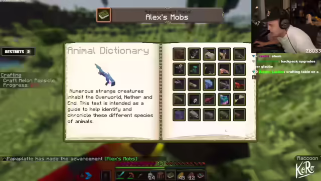 02:22:13Es werden Überlegungen angestellt, Rüstungsteile aus Kupfer herzustellen, da Kupfer reichlich vorhanden scheint. Die Soundeffekte des Spiels werden als sehr befriedigend empfunden. Eine Waffe und eine Spitzhacke werden hergestellt, und die nächste Quest erfordert die Suche nach Essen. Es wird festgestellt, dass eine abwechslungsreiche Ernährung im Spiel notwendig ist, was zu Überlegungen über mögliche Peppermil-Placements führt. Die Möglichkeit von Lucky Blocks wird diskutiert, und es wird erwähnt, dass Basti an einer Challenge mit Lucky Blocks arbeitet. Es werden Überlegungen angestellt, eine komplette Kupferrüstung herzustellen. Eine Pferdefamilie wird getötet, um an Essen und Leder zu gelangen. Es wird festgestellt, dass es in Königs Westerhausen, wo eine Ausbildung stattfindet, kein gutes Essen gibt, außer einer Mini-Pizza mit Spezialsoße am Bahnhof. Nach dem Erhalt von Full Armor wird die Suche nach einem Dorf fortgesetzt, um schlafen zu können.