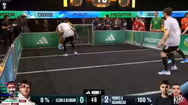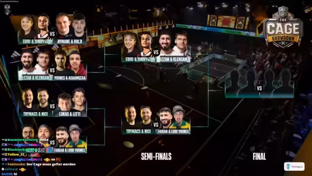 04:56:46Die Streamer starten den großen Cage Showdown, ein 2-gegen-2-Turnier im Käfig. Es werden die ersten Paarungen vorgestellt, darunter Ebru und Johnny gegen Alman und Burschi sowie Lesan gegen Klingan gegen Younes und Agamosa. Die Streamer kommentieren das Spiel live und interagieren mit Zuschauern. Die Atmosphäre ist aufgeregt, und die Teams zeigen Nervenkitzel und Begeisterung für das bevorstehende Ereignis.