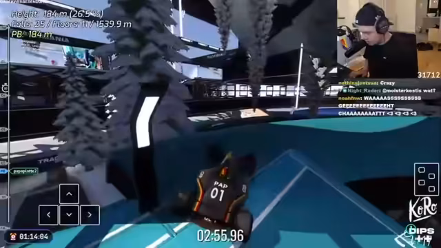 01:21:19Nach einem Reset setzt der Streamer seine Fahrt fort und gelangt an einen Bereich, an dem er mit einem Boost den nötigen Schwung für einen Sprung aufbauen muss. Obwohl er den Weg fast schafft, scheitert er und muss erneut von vorne beginnen. In der Pause unterhält er sich mit dem Chat über verschiedene Themen, darunter seine Fitness im Gym, das Essen, das ihm zubereitet wurde, und eine Wette über seine sportlichen Fähigkeiten. Er erwähnt auch, dass die Gameshow, die an diesem Tag stattfinden soll, um 20:30 Uhr beginnen wird.