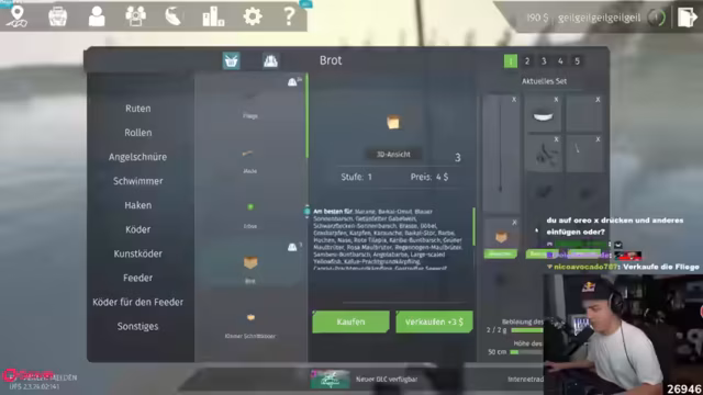 02:57:22Der Stream beginnt mit Frust über die Spielmechanik, da der Streamer denkt, gefickt worden zu sein, weil er Mais als Köder auswählen muss. Nach anfänglichen Problemen mit dem Köder und dem Levelsystem, entscheidet er sich für einen Rabatt-Skill. Trotzdem gelingt es ihm, einen Lapislazuli-Fisch und einen Bach-Saibling zu fangen, wobei letzterer zum Serverrekord wird. Die Laune bessert sich merklich und er beschreibt das Spiel als 'repetitive, aber Todesbock' machend.
