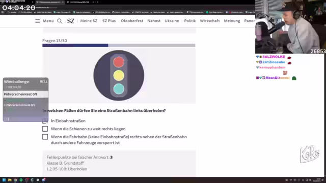 00:33:19Die zentrale Aktion des Streams ist der fünfte Versuch, den Führerschein-Simulator-Test zu bestehen. Der Streamer und sein Partner müssen innerhalb von vier Stunden den Test ablegen, wobei maximal zehn Fehlerpunkte erlaubt sind. Sie beantworten zahlreiche Fragen zur Straßenverkehrsordnung, darunter Themen wie Vorfahtsregeln, Verhalten in Baustellen, Tunneln und bei Überholvorgängen. Trotz anfänglicher Unsicherheit bei einigen speziellen Fragen schaffen sie es am Ende, den Test mit nur sechs Fehlerpunkten zu bestehen, was sie als großen Triumph feiern.