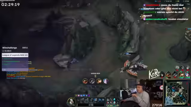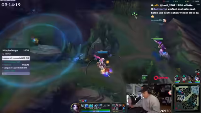 01:56:26Der Streamer erlebt aufregende und frustrierende Momente im League-of-Legends-Spiel. Er diskutiert mit seinem Team über Strategien, verliert jedoch häufig das Leben und erlebt negative Spielzüge wie Doppeln und Tripeln Crowd Control. Trotzdem betont er, dass er Spaß am Spiel habe, auch wenn er es als schlimmer als Counter-Strike empfindet, da nach einer schlechten Startphase kaum Chancen auf einen Sieg bestehen. Er lobt gelegentlich seine Mitspieler für gute Aktionen und kritisiert gleichzeitig vermeidbare Fehler.