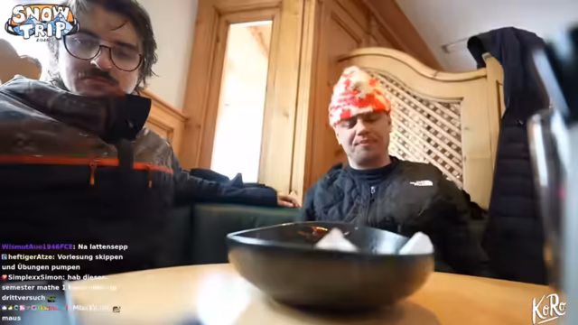 02:55:37Die Gruppe erreicht ein Restaurant im Tal, um eine Pause zu machen. Die Atmosphäre ist gemütlich, es werden Getränke bestellt. Gleichzeitig stellt sich das Problem, wie der noch fehlende Teilnehmer nach unten kommt. Parallel dazu gibt es technische Schwierigkeiten mit der Kamera, die ständig beschlägt. Die Situation wird mit Humor genommen, als die Teilnehmer über abgefahrenes Essen und einen möglichen 'Foodtrip' als zukünftiges Format spekulieren.