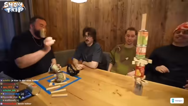 05:28:43Das erste Spiel der Olympiade ist der "Promilletower". Dabei müssen die Teams Hugo und Wieland sowie Gemini und Dominik innerhalb von drei Minuten den höchsten Turm bauen, während sie jeweils eine Brille tragen, die das Sehen bei einem Promillegehalt simuliert. Das Spiel erfordert Koordination und Ausdauer, wobei die Teilnehmer durch die Brillen stark in ihrer Wahrnehmung eingeschränkt sind. Die Teams bauen unter chaotischen Bedingungen an ihren Türmen, wobei es zu Spannungen und Späßen kommt.