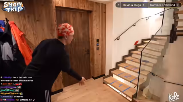 05:09:16Der Streamer kündigt die "2 gegen 2 Snowtrip Olympiade" für das gesamte Haus an. Er zeigt sich gespannt auf die von Kenny vorbereiteten Aktivitäten, da im gesamten Haus Gegenstände wie am Kamin, am Tisch und auf der Treppe abgeklebt sind. Auch kündigt er einen MrBeast-Challenge-Bereich an und erwähnt, dass überall im Haus Hinweise auf diese Aktivitäten zu finden sind. Die Stimmung ist ruhig und die Teilnehmer sind bereits mit der Vorbereitung beschäftigt.