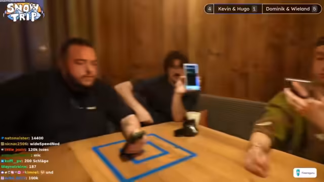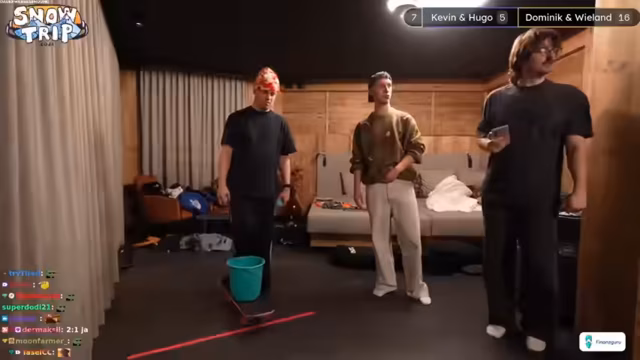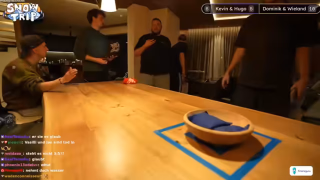 05:55:50Das Spiel Treppensack nähert sich dem Ende. Team Schwabenland führt mit 4 zu 2 und braucht nur noch einen Punkt zum Sieg, während Team Schimmelfuß (Gemini und Dominik) drei Punkte braucht. Werfen unter großem Druck ist entscheidend, da ein Fehler sofort das Spiel entscheiden kann. Der Fokus liegt auf der taktischen Wurfweise, um entweder Punkte zu sichern oder die Würfe des Gegners zu blockieren. Das Spiel bleibt bis zum letzten Wurf spannend und umkämpft.