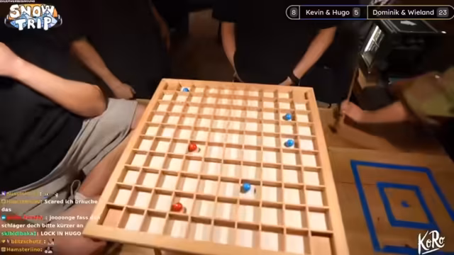 07:15:52Der Stream beginnt mit dem nächsten Spiel, dem Piratenbillard. Die Streamer sind sich nicht sicher über die genauen Regeln und tauschen sich während der ersten Runden aus. Das Ziel ist es, den Ball ins gegnerische Feld zu spielen. Ein erfolgreicher Schlag in die Endzone bringt drei Punkte, während ein zu starker Schlag, der den Ball aus dem Tisch befördert, null Punkte bedeutet. Die erste Runde wird als sehr intensiv und unübersichtlich beschrieben.