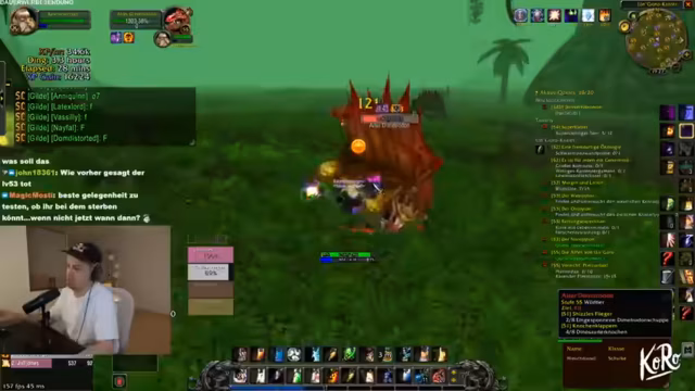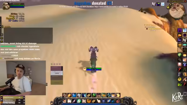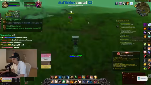 03:12:50Während des Questens in Tanaris stößt der Streamer mit einem Begleiter auf einen Elite-Boss, den Riesendino, der plötzlich erscheint und die beiden in eine lebensbedrohliche Situation bringt. Obwohl der Boss im Combat-Log nicht erscheint, greift er an und die beiden haben nur wenig Lebenspunkte und Mana. Dank der Hilfe eines anderen Spielers namens Ritzmann können sie dem Angriff entkommen und es bleibt eine knappe, aufregende Begegnung zurück.