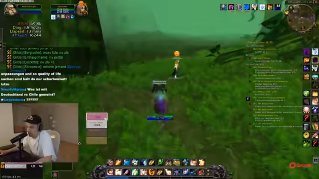 00:56:12Nachdem die technischen Probleme soweit gelöst sind, wechselt der Stream zu World of Warcraft. Er und seine Mitstreiter leveln ihre Charaktere im Gebiet Un'Goro Krater. Das Ziel ist es, Level 54 zu erreichen, wobei sie von der gesammelten "Rested XP" profitieren, die doppelten Erfahrungspunkte garantiert. Der Streamer betont, dass das Gebiet, das sie durchqueren, sicher ist, besonders wenn man in einer Gruppe von drei oder vier Spielern ist. Dazu nutzen sie Add-ons, die vor Elite-Gegnern warnen.