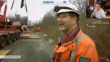 01:04:48Nach dem Unfall beginnt die komplexe und aufwendige Bergung des 240 Tonnen schweren Gastanks. Eine 1.500 Quadratmeter große Fläche wird mit Holzbohlen befestigt, um das Gewicht der benötigten Kräne zu tragen. Der aufwendigste Moment ist die Trennung des verunglückten Tanks von dem mitgerissenen Tieflader. Nach einer stundenlangen, spannungsgeladenen Operation gelingt es den Arbeitern, den Tieflader bergen, während der Tank stabil im Graben bleibt.