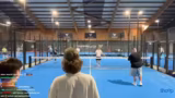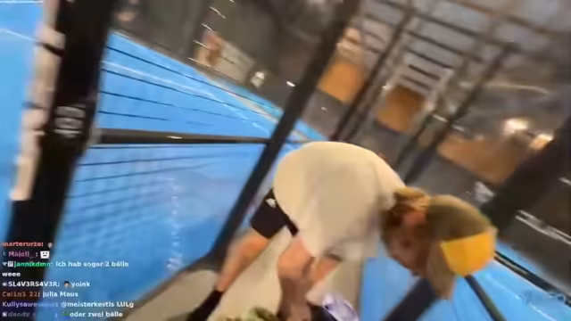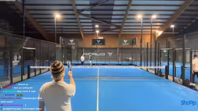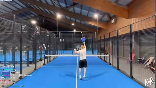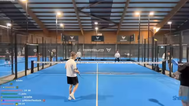05:33:33Die Aufwärmphase ist beendet und es beginnt eine offizielle Partie Padel-Tennis. Der Streamer fungiert als Schiedsrichter und zählt die Punkte nach der traditionellen 15er-Regel. Das Spiel ist von intensiven Ballwechseln und spannenden Rettungsmanövern geprägt, bei denen der Streamer selbst aktiv mitspielt und die Taktik der Spieler kommentiert.